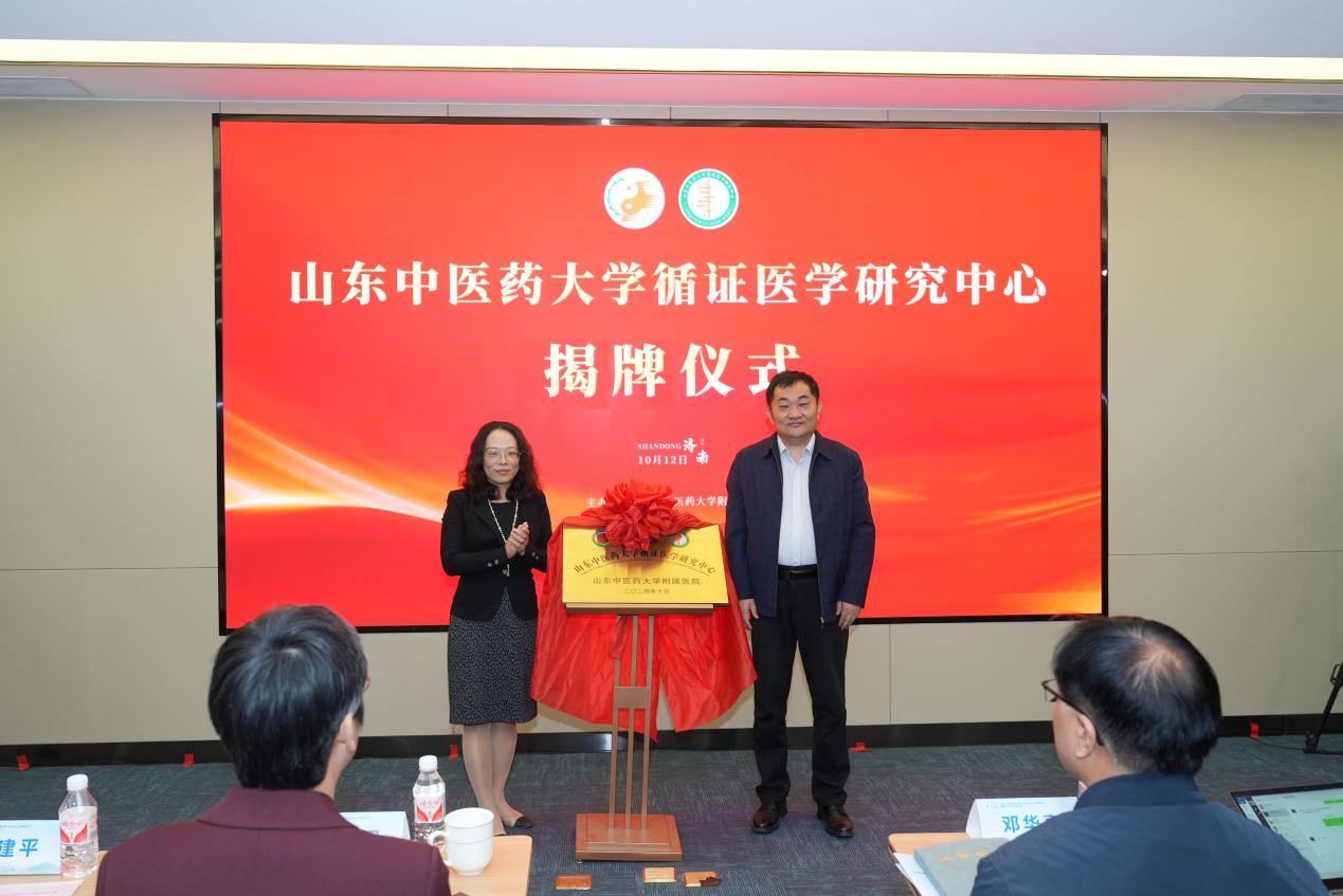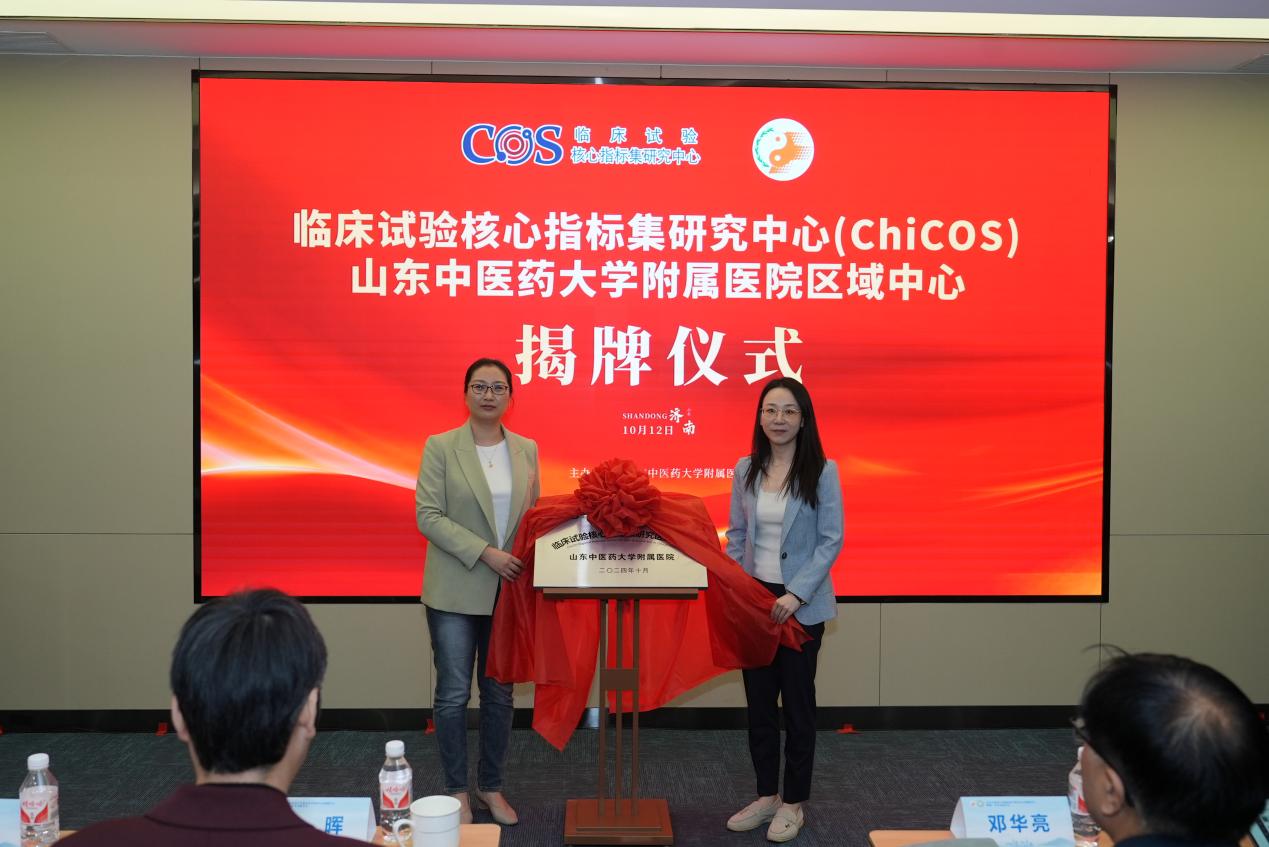 随后,大学医院发展处处长郭栋与医院科技处处长李静蔚为山东中医药大学循证医学研究中心揭牌;天津中医药大学循证医学中心庞博博士和临床研究中心王怡斐主任共同为临床试验核心指标集研究中心(ChiCOS)山东中医药大学附属医院区域中心进行揭牌。