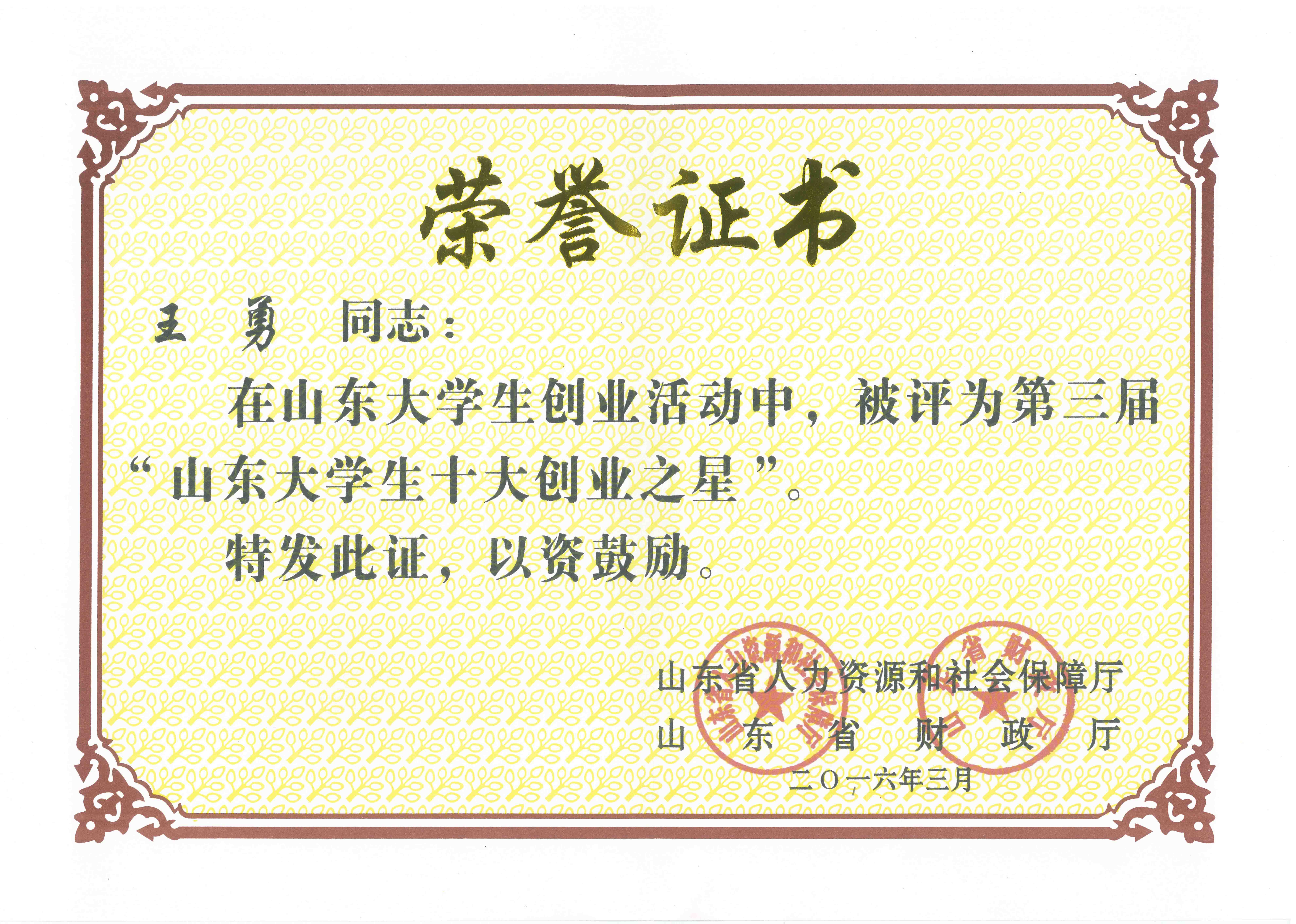 热烈祝贺我集团公司董事长王勇荣获“山东大学生十大创业之星”——记全省高校毕业生就业创业工作会议暨表彰