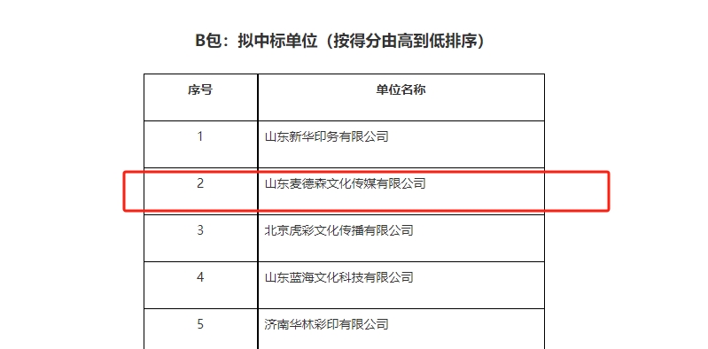 近日,《山东大学出版社2024-2027年度图书印装定点合作厂入围招标项目中标公告》正式发布。山东麦德森发展集团旗下山东麦德森文化传媒有限公司成功入围双包。