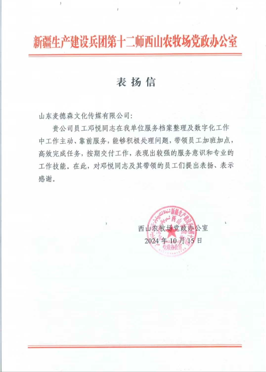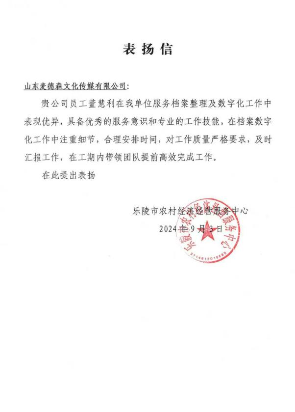 标准升级还体现在对服务细节的精益求精上。在项目运作过程中,档案数字化团队的同事们以高度的专业精神和责任感全身心投入到工作当中,面对时间紧迫、内容复杂的海量任务,他们每一个环节都严谨对待,不放过任何一处瑕疵。凭借娴熟技艺与合理流程,他们加班加点、高效出色地完成了工作任务,并获得客户赞扬。据统计,仅2024年,就有乐陵市农经局项目、新疆生产建设兵团第十四师档案馆项目、新疆生产建设兵团第十二师西山农牧场项目、淄博职业学院项目的客户给项目经理董慧利、邓悦、王兴达发来了表扬信。客户的表扬,既是对上述同事秉持“感恩奉献、追求卓越”服务精神的高度评价,也是对团队实施服务标准升级的充分认可。