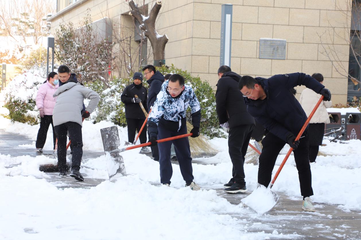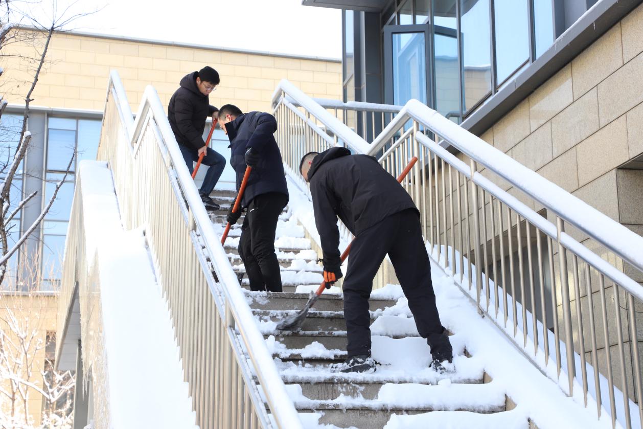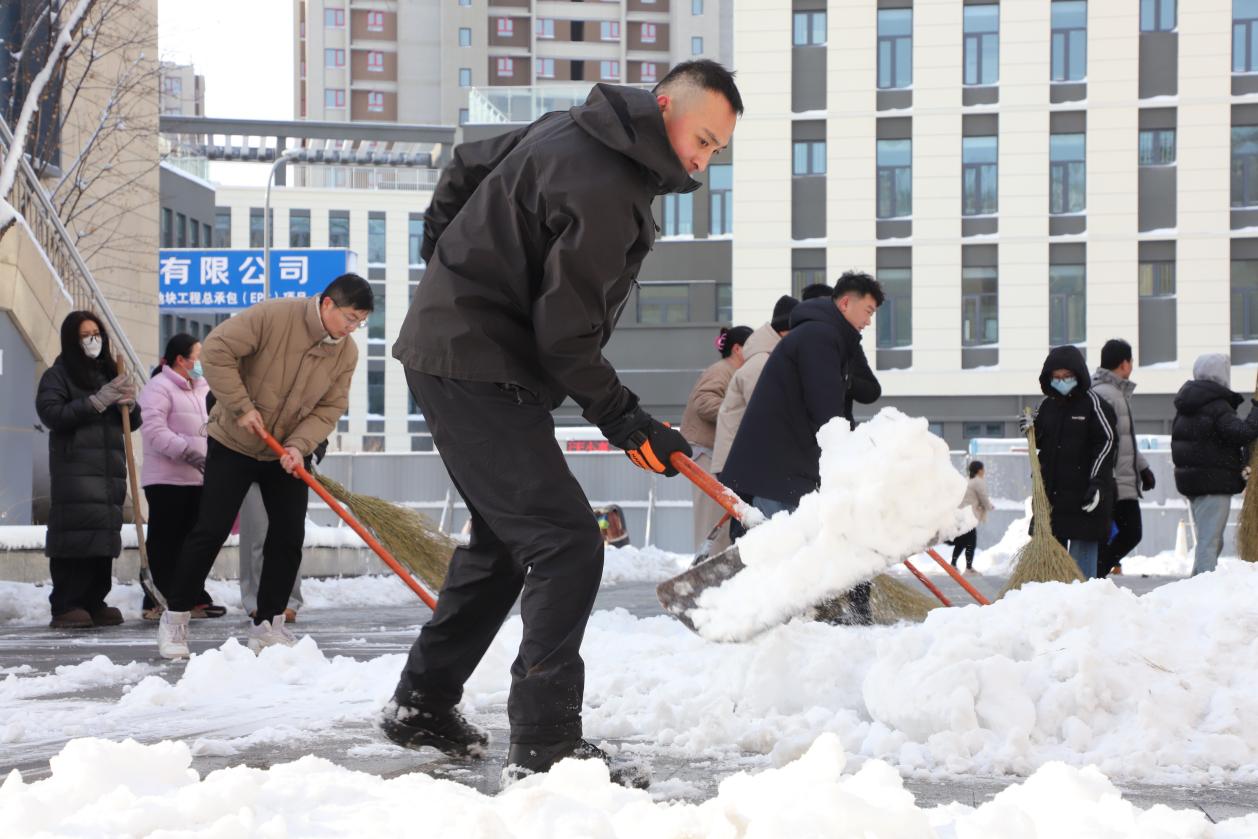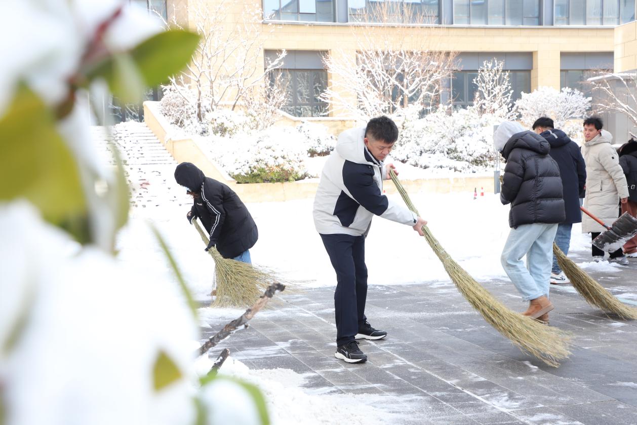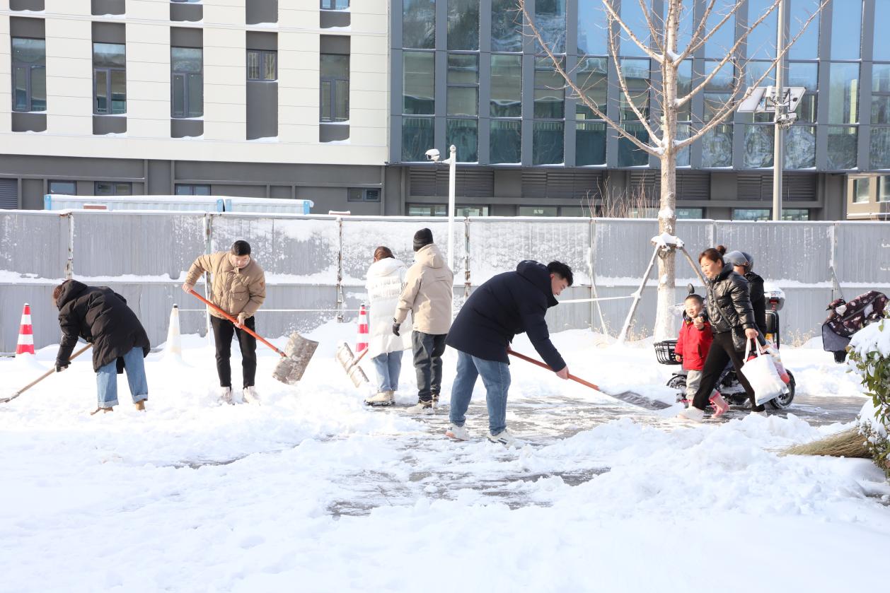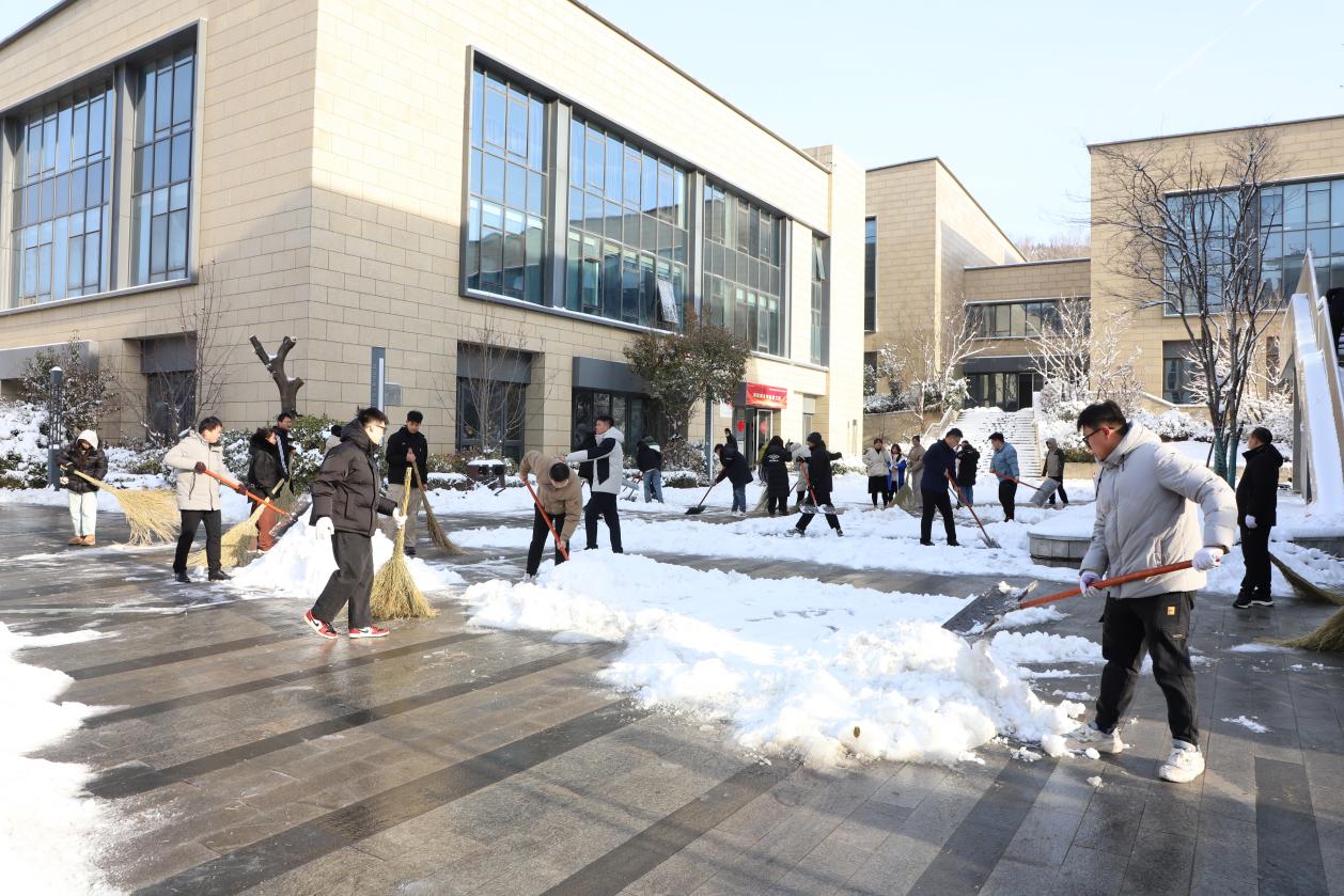 大家双手冻得通红,脸上却写满坚定,一心只为尽快打通出行通道,全力保障员工和附近居民出行安全。经过一个多小时的共同努力,及时清除了园区内道路和周边道路的积雪和冰面。