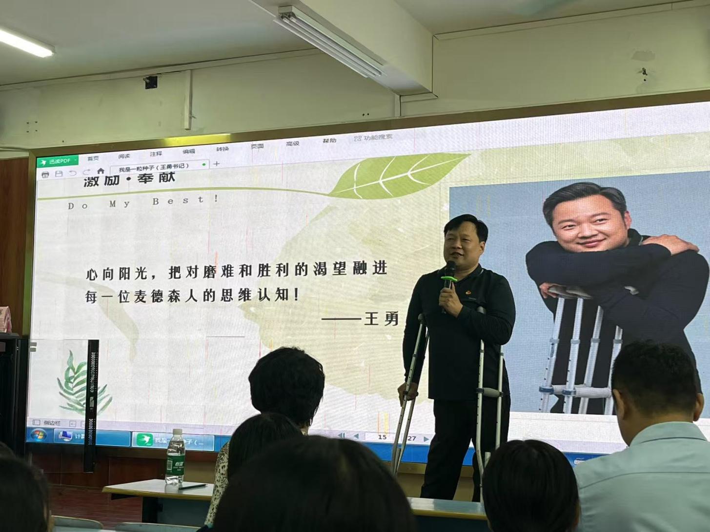 全国自强模范,中国青年五四奖章获得者,中华慈善奖慈善楷模,山东麦德森发展集团党委书记、董事长王勇走进校园,以《我是一粒种子》为题,为全校师生带来了一场感人至深的励志演讲。