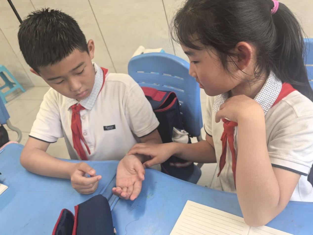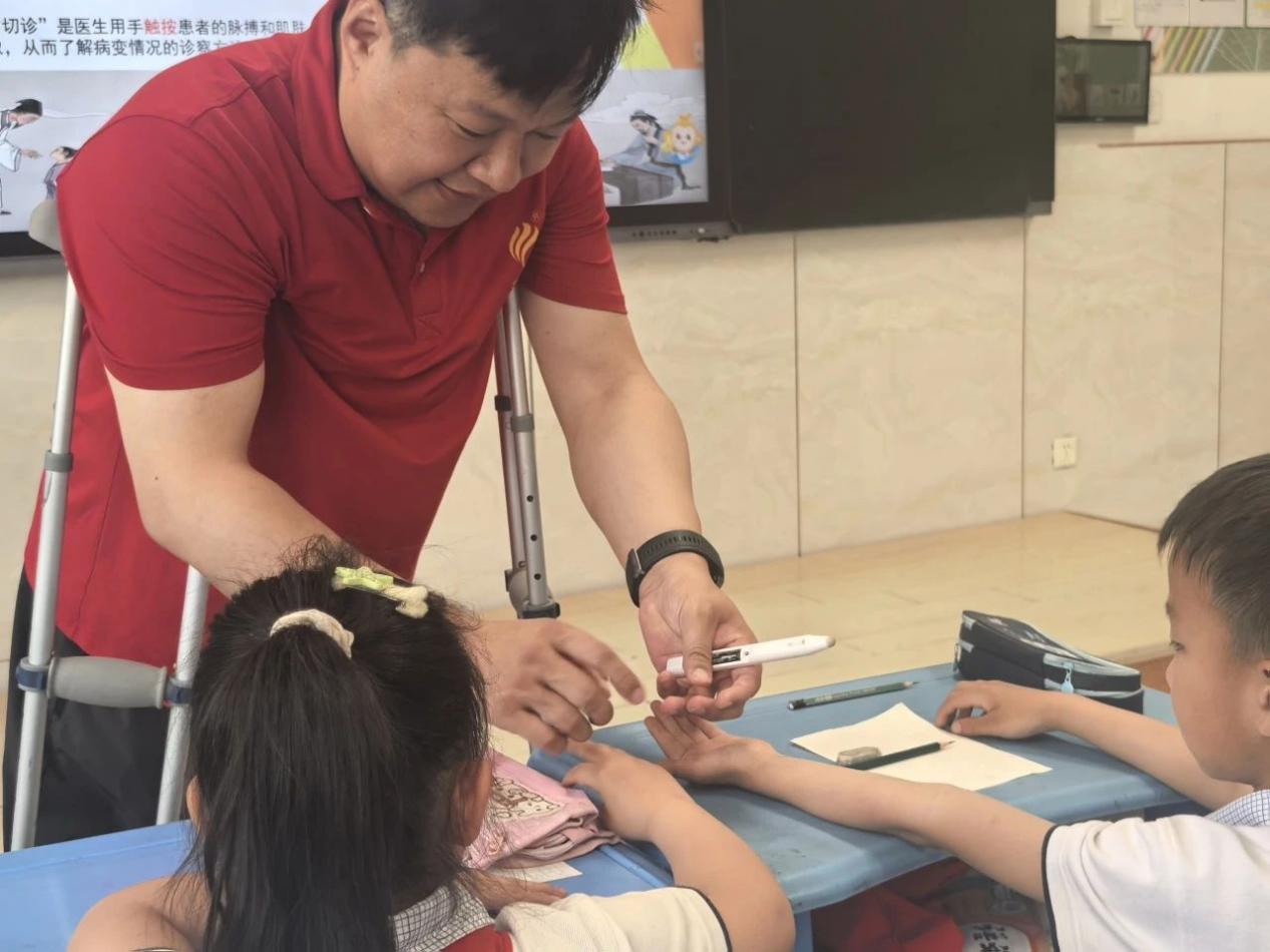 最后,王勇书记亲自为同学们示范把脉的方法。在王勇书记的指导下,孩子们纷纷伸出小手,有模有样地在穴位上轻轻按压,现场洋溢着浓厚的学习氛围。通过亲身体验,孩子们领略了中医的神奇魅力,同时掌握了一些实用的自我保健小技巧。