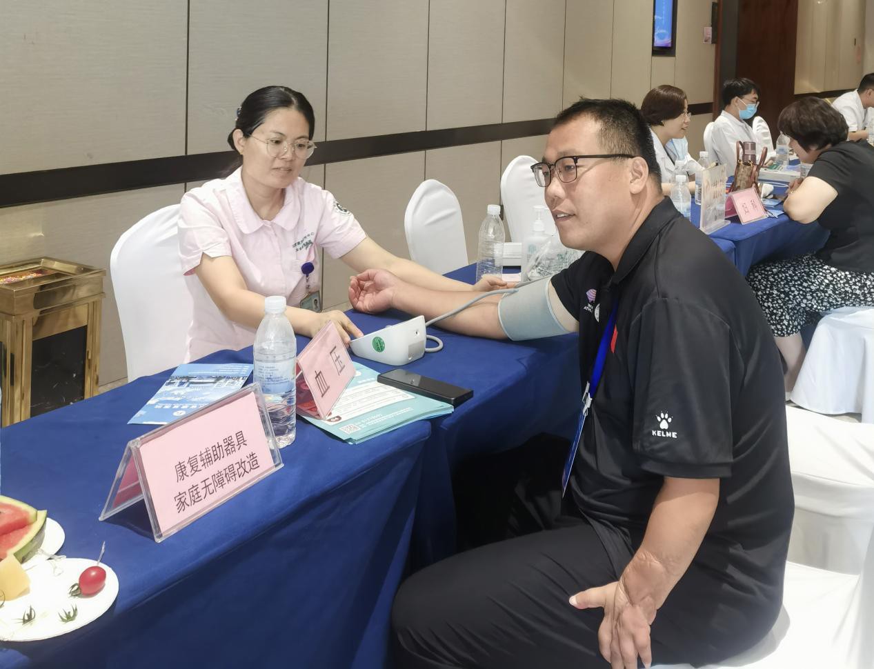 在庆祝第十六次全国‘肢残人活动日’暨全国无障碍旅游高质量发展工作交流会现场,山东省康复研究中心的医护人员和麦德森医疗保障组工作人员身着整齐的工作服,带着饱满的热情迅速投入到义诊服务中。他们分工明确、配合默契,为参会的肢残人代表提供全面细致的医疗服务。