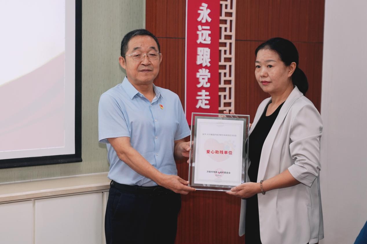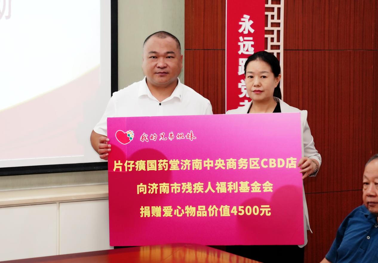 片仔癀国药堂济南中央商务区CBD店向济南市残疾人福利基金会捐赠爱心物品,市残疾人福利基金会理事长程强为其颁发荣誉牌匾,并现场向受助代表发放爱心物品。