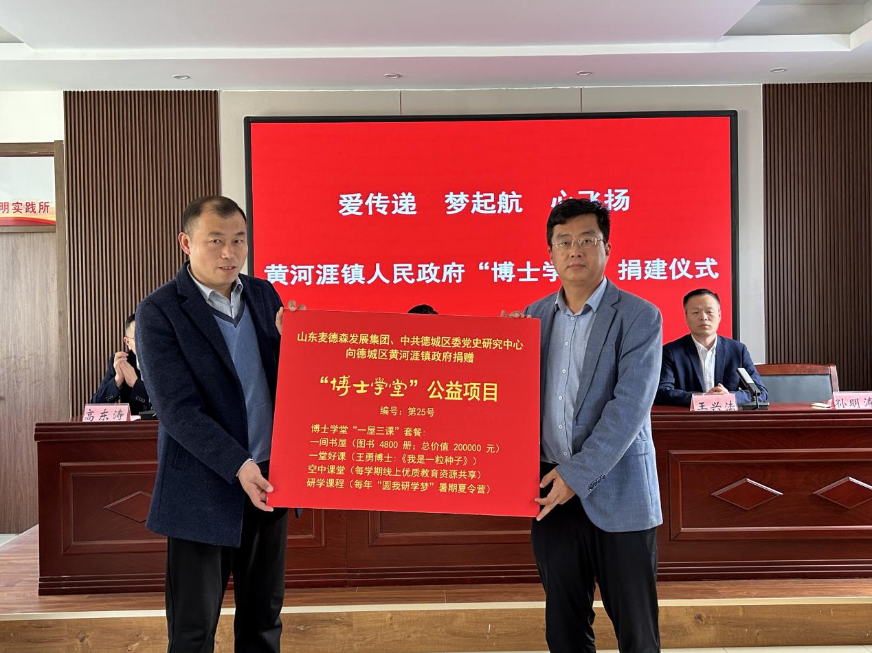 10月24日,“爱传递·梦启航·心飞扬——德州市德城区黄河涯镇政府‘博士学堂’捐建仪式”在黄河涯镇政府会议室举行。