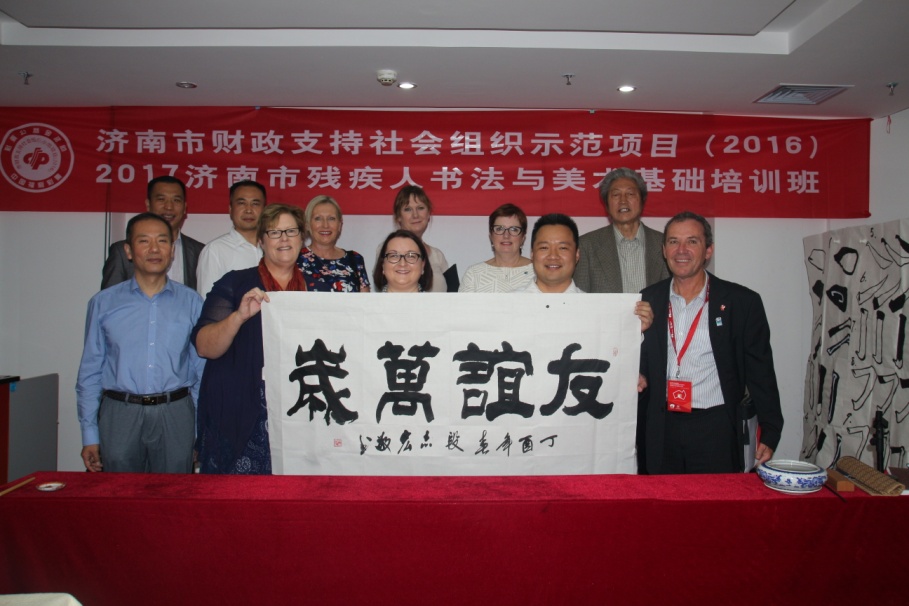 在王勇董事长的带领下,分别考察了我集团的文化长廊、多功能活动室,缪丽尔·柯比对展架上的艺术品、手工艺品频频称赞,并鼓励王勇董事长再接再厉,把残疾人文化产业做优做大做强。参观当天,“文艺支教 携手助残”济南市残疾人文联首届书法与美术培训班正在我集团多功能活动室举行,代表团积极与书法家交流,同残疾人学生们一起学习书法,展现出极大的兴趣。山东省书法家协会会员段志宏老师现场为外国友人书写了《友谊万岁》的书法作品。