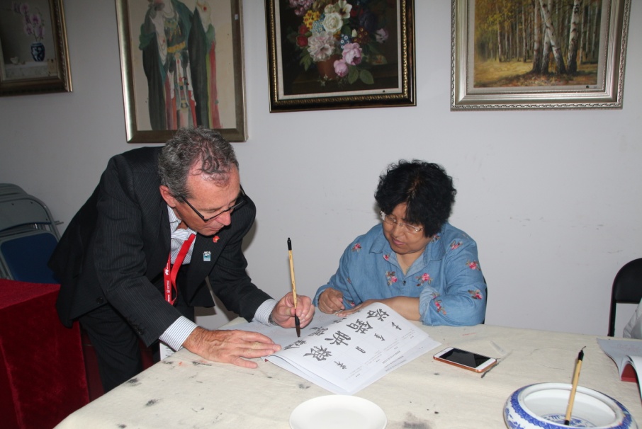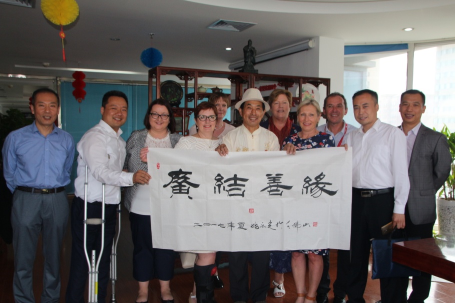 参观结束,在王勇董事长的陪同下,考察团来到集团会议室,简单交流了彼此的建议以及共谋残疾人事业发展的决心。济南市残疾人文联书法家协会副主席姚乐光为外国友人精心准备了书法作品,用传统的热情表达对考察团的欢迎。