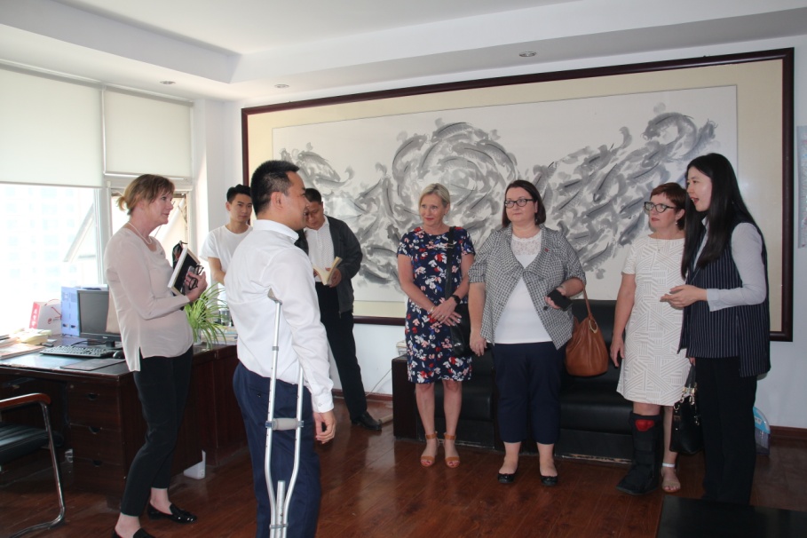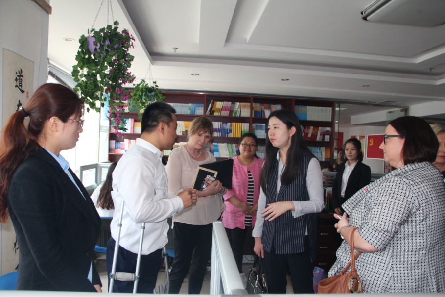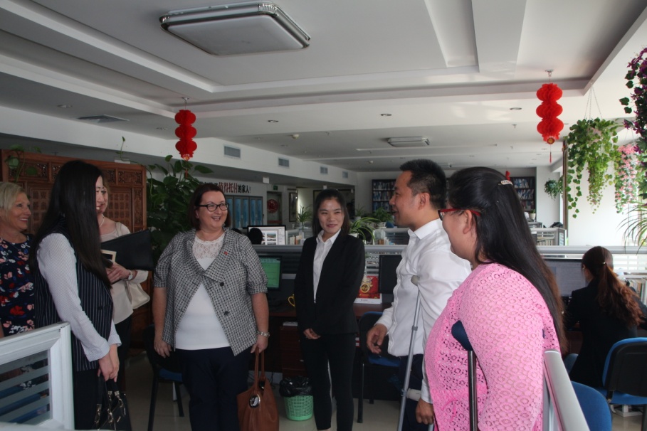 随后,缪丽尔·柯比一行6人参观了我集团的史志部、电商部——麦德森阿里巴巴国际站以及出国留学和博览医书项目,了解了中华民族传承文化的媒介——志书和中医中医药文化走向世界的腾飞翅膀——博览医书系统,对以电子商务方式助力残疾人文化事业的发展提出高度赞扬。山东麦德森出国留学服务有限公司总经理田凌,与缪丽尔·柯比进行了交谈,通过交流她了解到我集团提供到澳大利亚的留学服务,她感到很高兴,希望在今后的工作中不管是在残疾人事业发展,还是在一些促进两国友好的合作项目中,双方都能够有更多的合作,以最大的诚意,展出最亮眼的成绩。