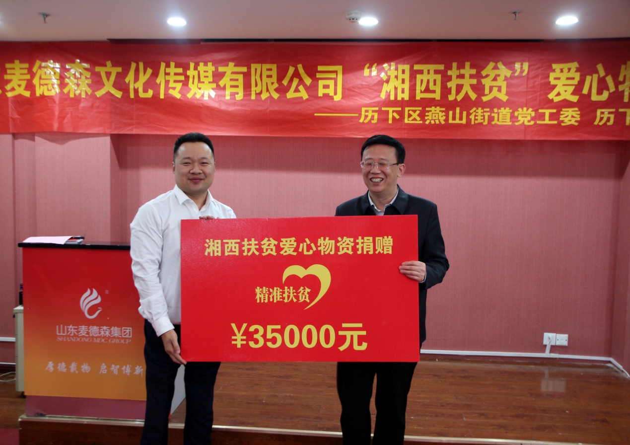 坚决打赢脱贫攻坚战,是党的十九大提出的明确要求。2018年,历下区燕山街道办事处开展精准扶贫行动,我集团积极参与“万企帮万村”扶贫活动,结对帮扶湘西州永顺县青坪镇洞坎河村。2019年1月,王勇博士在“湘西扶贫”爱心物资捐赠仪式上捐赠爱心物资35000元。