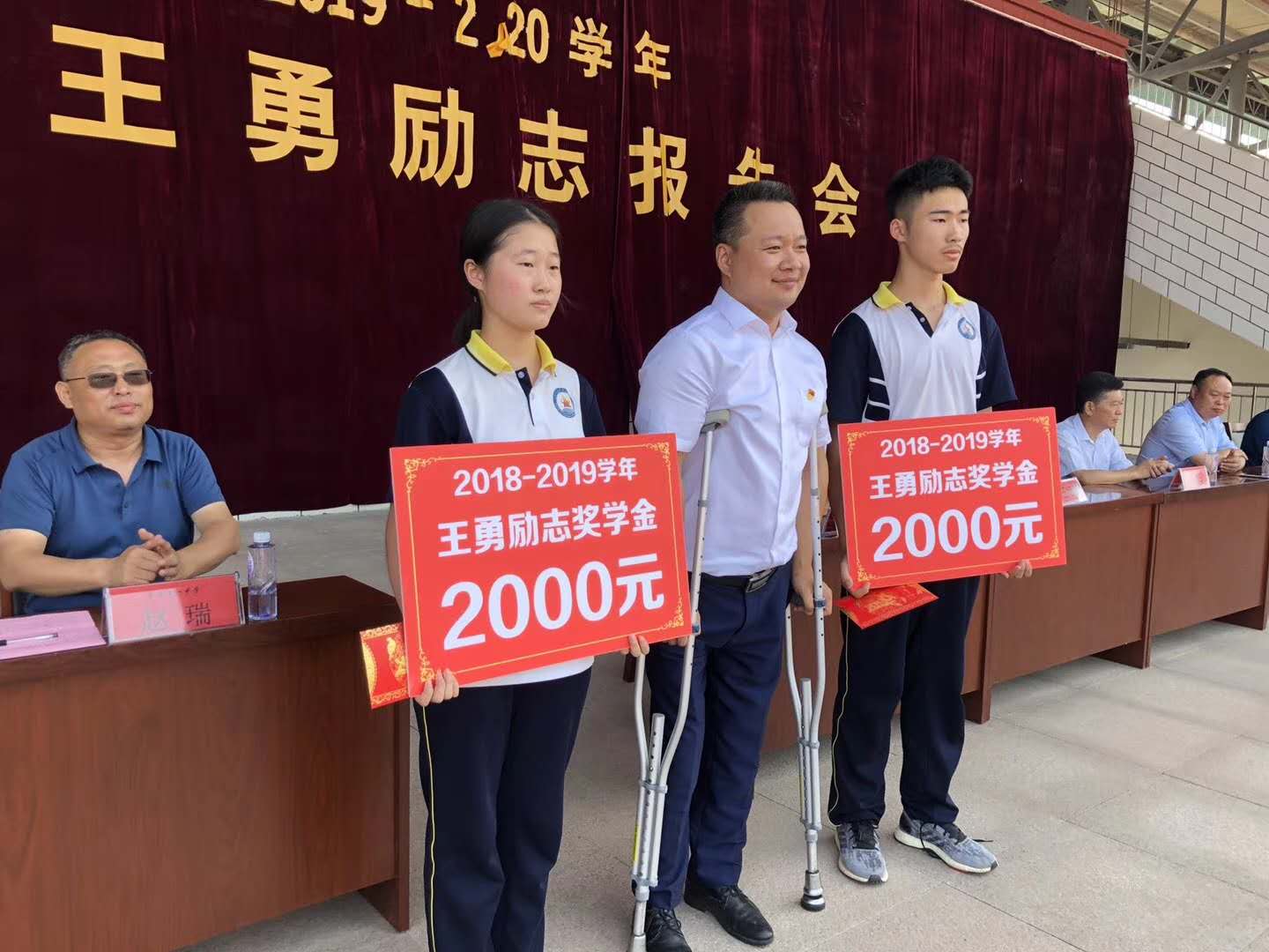 自2018年起,王勇博士捐资30万元设立了“单县一中王勇励志奖学金”,每年出资最少5万元用于奖励品学兼优的优秀学子。2019年9月,王勇博士回到母校单县一中出席2019-2020学年开学典礼并现场发放本年度“王勇励志奖学金”。