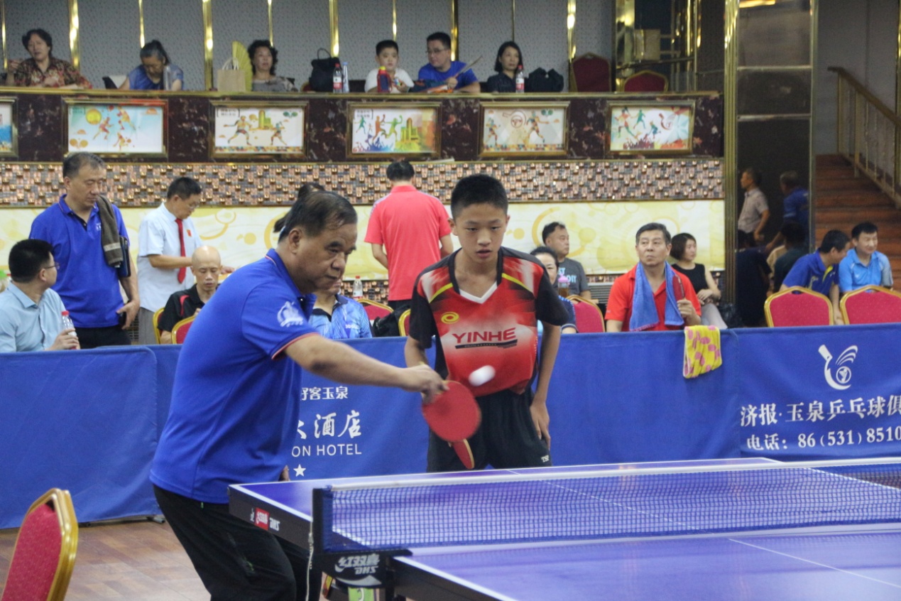 71岁的玉泉集团董事长常金月与13岁的汝吉智组合打出精彩好球