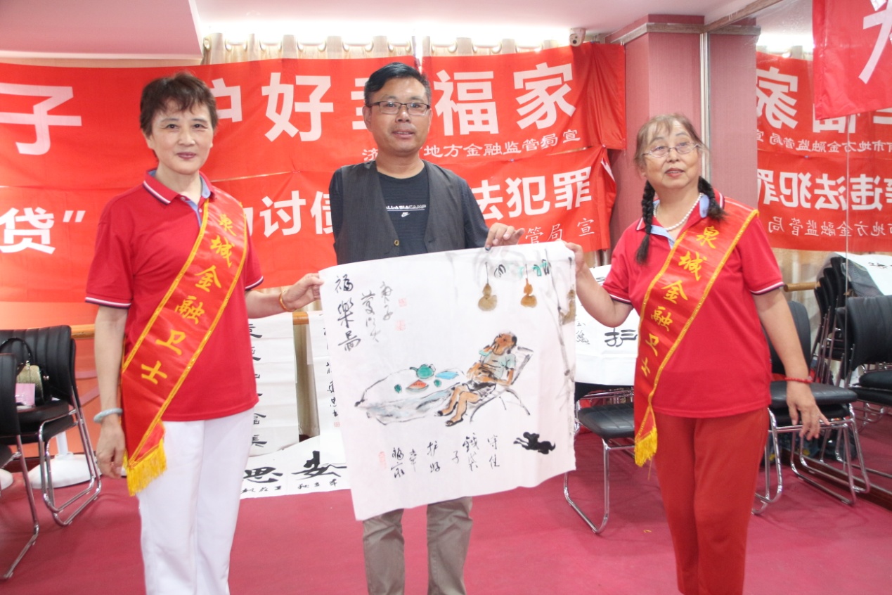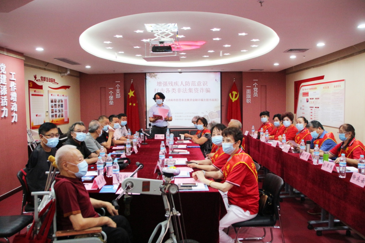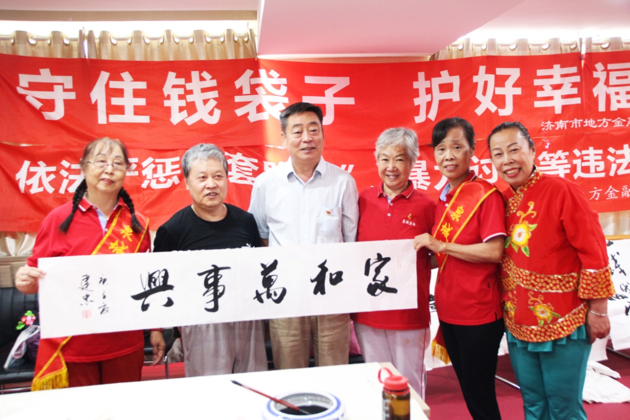 8月7日,增强残疾人防范意识、打击各类非法集资诈骗——济南市残疾人艺术家“防范非法集资金融诈骗”主题笔会在我集团党群活动室举行。济南市残联宣文处副处长刘大新,泉城金融卫士志愿者宣传团党支部书记、团长赵银光,原济南市老龄委主任、泉城金融卫士志愿者宣传团顾问团团长于敏等领导出席活动。济南市残疾人福利基金会副理事长吴哲主持活动,济南市残疾人文学艺术界联合会主席、我集团党支部书记王勇博士出席活动并致辞。残疾人画家、书法家、剪纸艺术家、泉城金融卫士志愿者宣传团团员等30余人参加活动。
