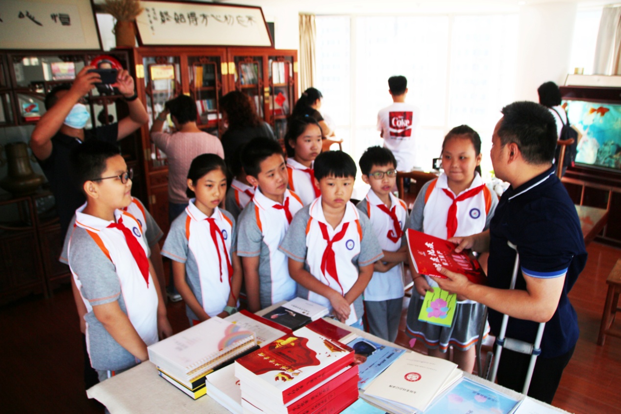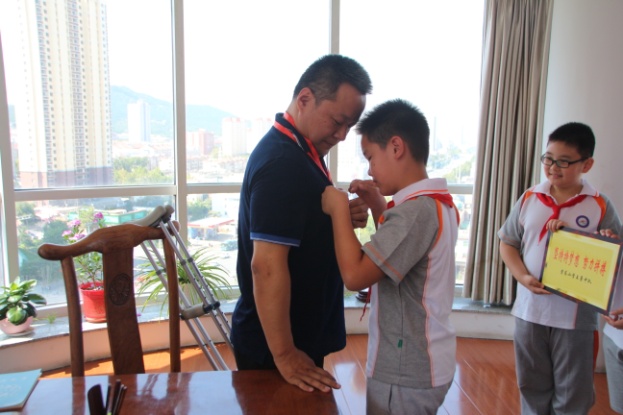 “作为新时代的少年队员,我们要学习您乐观、自强不息、不服输、不认输的精神,不畏困难、积极乐观的人生态度。我们将树立远大梦想,并坚定地用实际行动和努力去实现这个梦想!”在党建活动室,“王勇中队”队员们围绕自己的“梦想”积极与王勇博士进行交流。同时,队员代表亲手为王勇叔叔佩戴了纪念奖牌、纪念奖章,并将大家精心制作的“纪念牌匾”赠送到王勇叔叔手中。