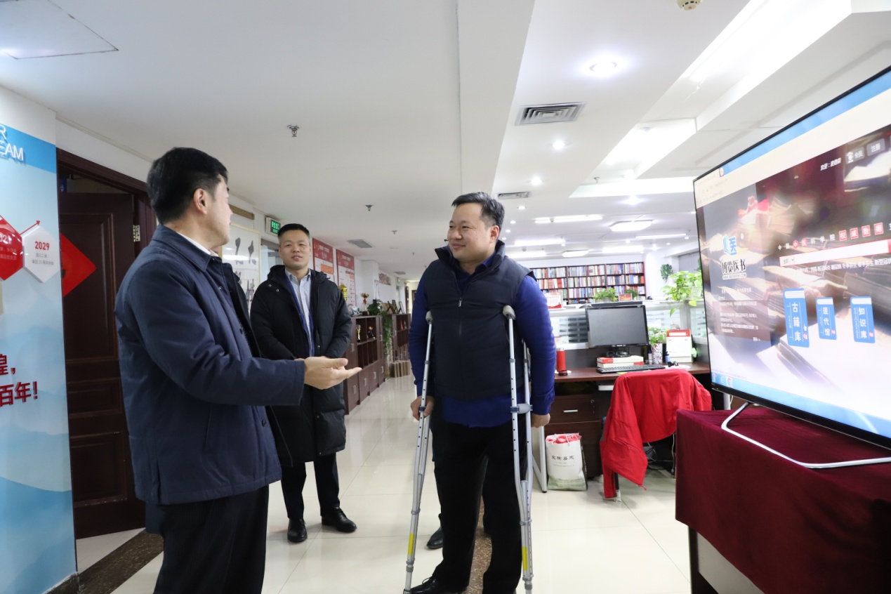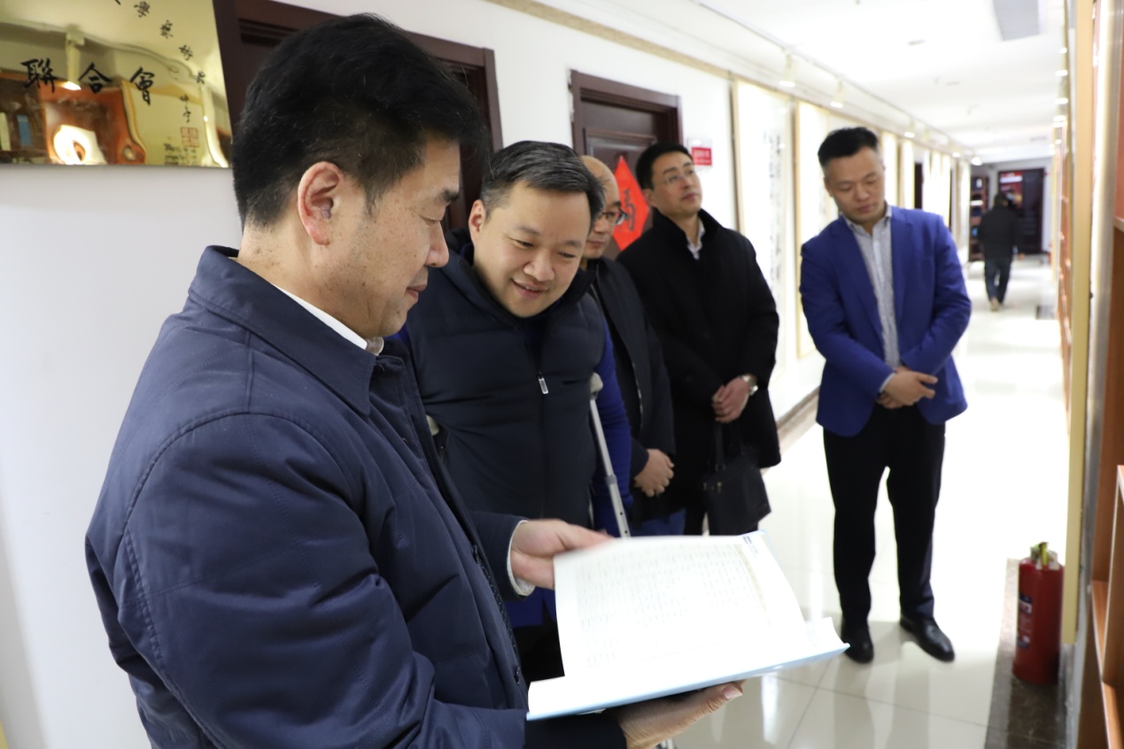 在王勇博士的解说和引导下,郭之祥一行实地考察了集团总部各职能部门办公区域,详细询问了解了集团“博览医书”、图书出版等方面工作内容。在调研“博览医书”项目时,郭之祥指出,中医古籍的汇编,需要耗费特别大的精力和毅力,中医药文化的传承非常需要这样的力量。王勇博士表示:“我们做一点点,就推动了一点点,‘博览医书’还可以做的更多,做得更加细致、更加完善。”