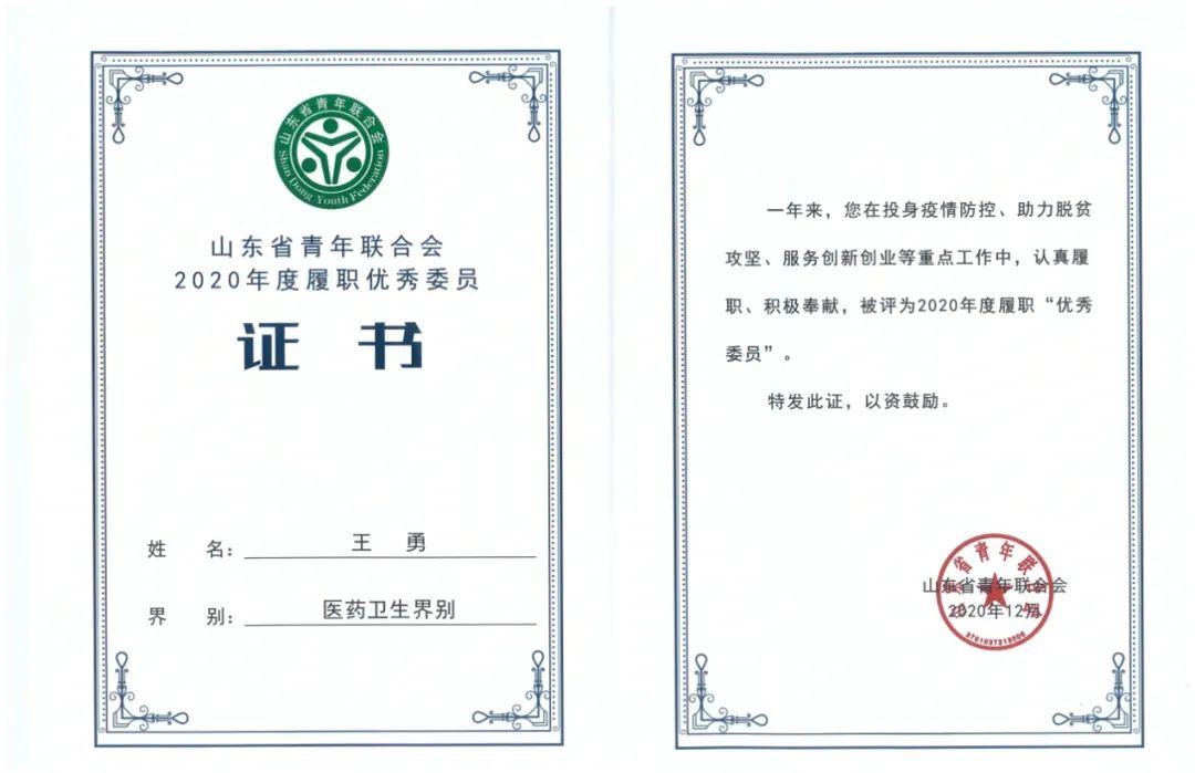 王勇书记荣膺山东省青年联合会2020年度履职优秀委员
